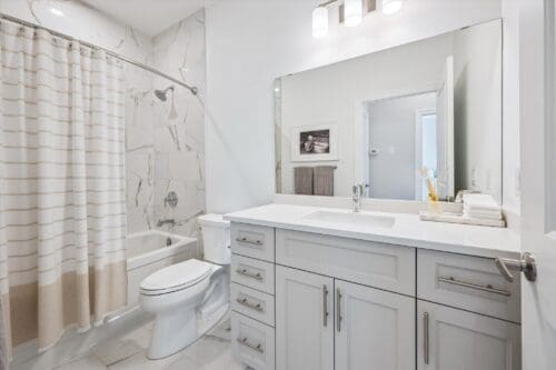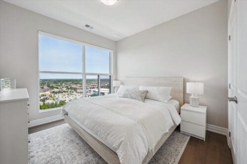 Retreat to the spacious primary bedroom, where floor-to-ceiling windows deliver the same breathtaking vistas and fill the room with natural light. A luxurious four-piece bathroom showcases an oversized vanity with quartz counters and a deep soaker tub surrounded by marble-inspired tile.