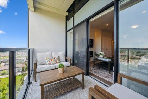 Meticulously designed with upscale finishes, this modern suite exudes both comfort and sophistication. Soaring ceilings and wide-plank engineered hardwood floors create an airy, sun-drenched ambience that flows seamlessly through the open-concept living space. Relax by the sleek built-in fireplace in the living room or step onto your private balcony—a perfect retreat to sip morning coffee or unwind while taking in the beautiful city views.