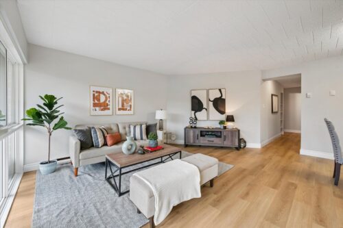The spacious living and dining area is flooded with natural light from a full wall of windows. Freshly updated with neutral wide-plank flooring, this open-concept space is perfect for both relaxing and entertaining. Sliding doors lead to your large private balcony overlooking greenery – an ideal spot for your morning coffee or unwinding at the end of the day.