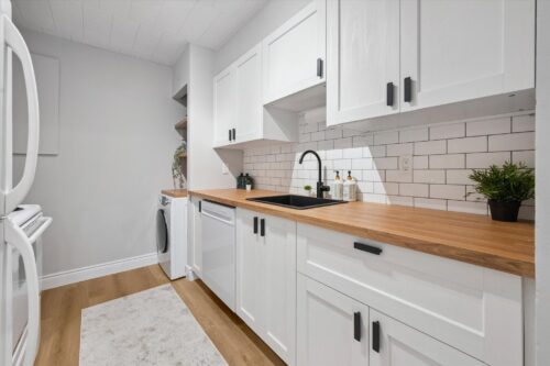 Step inside and you’ll immediately notice the brand-new flooring and the tastefully renovated kitchen, featuring crisp white shaker cabinetry, butcher-block countertops, subway tile backsplash, modern black hardware, and a sleek black sink. The thoughtful addition of open shelving and in-suite laundry makes this kitchen as functional as it is stylish.