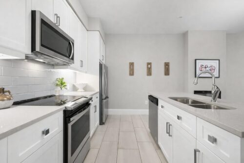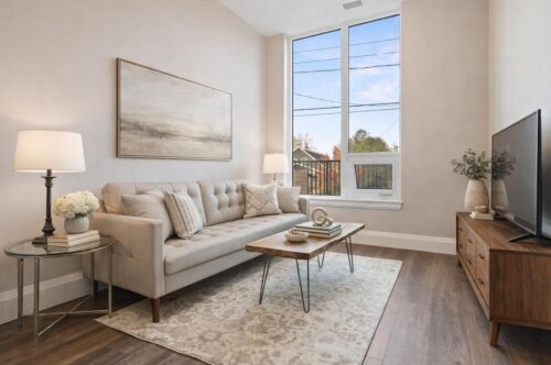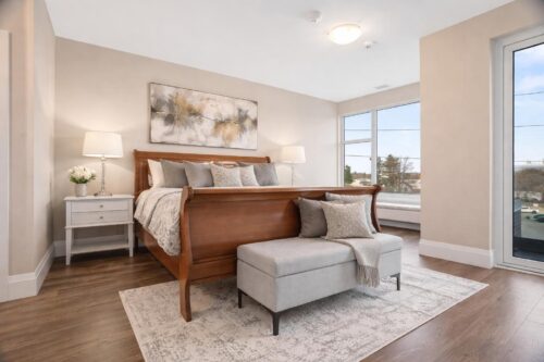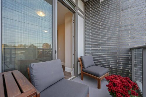 Upstairs, the second floor features two spacious bedrooms, each with laminate floors, high ceilings, ample closet space, and large windows that fill the rooms with light. One bedroom even boasts a private balcony – an ideal spot for enjoying your morning coffee or unwinding with a good book. This floor offers direct access to the main building, connecting you to Metalworks’ outdoor community spaces and first-class amenities.