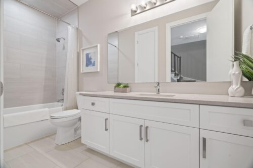 On the third level, you’ll find the luxurious primary suite, your private retreat. Enjoy an expansive walk-in closet, a wall of windows, and exclusive access to your own balcony. The spa-like ensuite bathroom is complete with a deep soaker tub, an oversized vanity with quartz countertops, and a walk-in glass shower with elegant tile work. Conveniently, this floor also features a laundry room with ample storage and folding space.