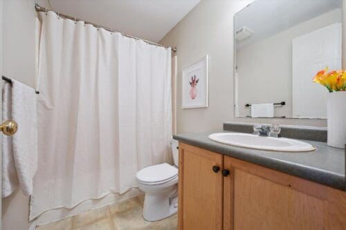 Upstairs, the primary bedroom offers generous space with his-and-hers closets and multiple large windows, creating a peaceful retreat filled with natural light. Two additional bedrooms offer ample closet space, and versatility for family, guests, or a home office. A well-appointed four-piece main bathroom includes a large vanity and a combined shower/tub setup.