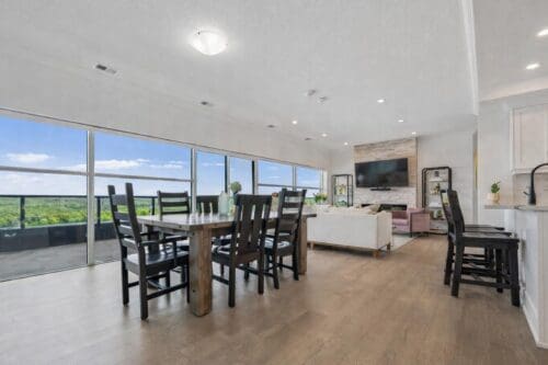 From the moment you step inside, the impact is immediate. A breathtaking wall of floor-to-ceiling windows spans the living and dining areas, flooding the home with natural light and framing uninterrupted treetop views that stretch as far as the eye can see. The open-concept layout feels expansive yet welcoming, ideal for both everyday living and entertaining on a grand scale. The generous dining area flows seamlessly into the living room, where a striking fireplace feature adds warmth and architectural interest.