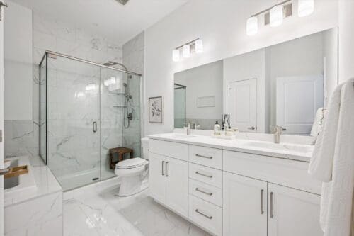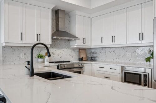 The heart of the home is the stunning, chef-inspired kitchen. Crisp white cabinetry is complemented by an elegant backsplash, quartz countertops, and a generous island with breakfast bar seating. High-end stainless steel appliances, including a statement range hood and built-in microwave, complete a space that is as functional as it is beautiful.