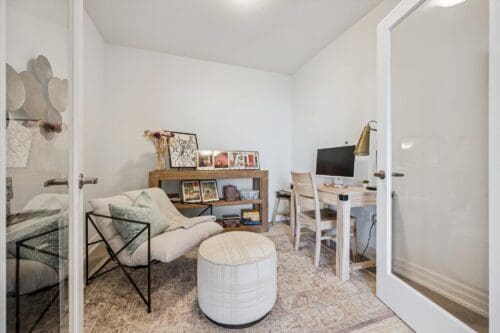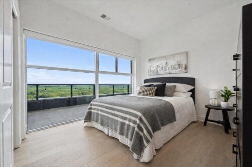 The primary suite is a true retreat, featuring the same dramatic wall of windows and serene views, a walk-in closet, and a luxurious ensuite with a double quartz vanity, a deep soaker tub, and a walk-in glass shower finished with beautiful tile. Two additional spacious bedrooms offer large windows and ample closet space. Glass French doors open to a dedicated den, perfectly suited for a home office or reading room. A stylish four-piece bathroom with quartz countertops and a walk-in glass shower, along with a separate powder room, complete the layout.