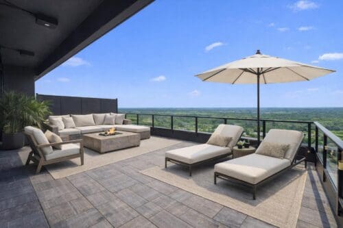 Sliding doors lead to the showpiece of this home. A massive 1,042 square foot, south-facing private terrace offering unobstructed views over lush green space, tranquil water, and miles of trails. Designed for unforgettable gatherings or peaceful moments alike, this outdoor retreat easily accommodates multiple seating areas. Whether hosting under the stars or enjoying a quiet morning coffee, this terrace isn’t just an extension of the living space, it’s your serene retreat from the hustle and bustle of everyday life!