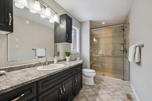 One of the standout features of this home is the professionally finished basement (2023), completed with permits and over $110,000 invested in creating a high-quality, functional space. The large recreation room is warm and inviting, featuring an electric fireplace, abundant pot lighting, and four windows. A custom stone bar with a built-in beverage fridge and wine storage makes this space ideal for entertaining. There is plenty of room for a gym, games area, or playroom. The lower level also includes an additional bedroom with a double closet and a modern 3-piece bathroom with quartz counters, an oversized vanity, and a double glass shower. The separate entrance offers excellent potential for an in-law or income suite. Additional upgrades include 200-amp electrical service and fresh paint throughout.