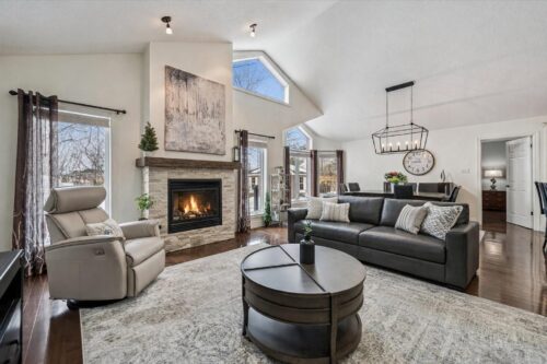 Upon entering, you’ll notice the sun-drenched open-concept living and dining areas, which create an inviting and elegant space for both everyday living and entertaining. Rich hardwood floors and soaring vaulted ceilings enhance the sense of openness, while oversized windows fill the home with natural light and showcase peaceful green space views. A beautiful stone fireplace creates a warm atmosphere to relax and unwind, and the dining room offers the perfect setting for hosting.