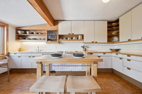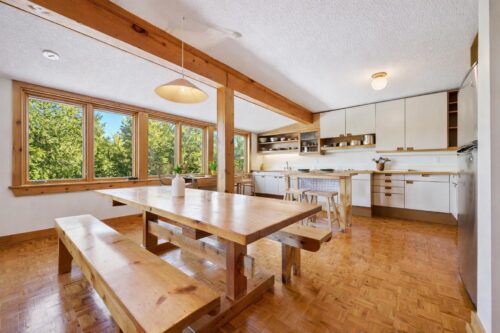 The bright and inviting kitchen features ample prep space, fresh, clean-lined white cabinetry, and high-end stainless steel appliances, including a stovetop, built-in oven, and microwave. Open wood shelving and thoughtfully curated details, such as a rustic wood beam, add warmth, character, and visual interest, creating a space that feels both timeless and welcoming. The true highlight is the charming dining area, surrounded by large windows that frame stunning views of the private backyard and river beyond, creating a peaceful, nature-filled backdrop for morning coffee, quiet meals, and memorable gatherings. A walkout to the massive back deck creates seamless indoor-outdoor flow.