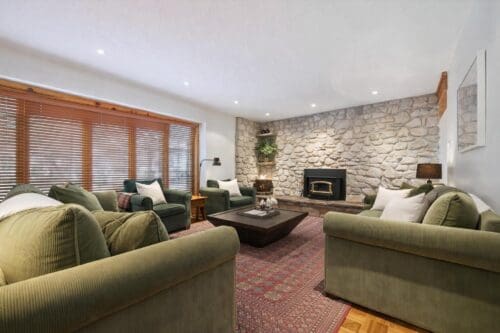 Upon entering, you’ll notice the impressive living room anchored by a gorgeous stone fireplace that creates a striking focal point and the perfect place to relax and unwind. Rich wood floors and rustic beams add warmth and character, while oversized windows bring in soft natural light.