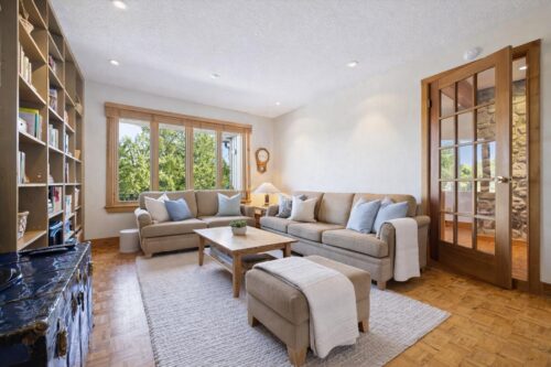 Off the kitchen, you’ll find a beautiful family room filled with natural light from two large windows and a striking wall of floor-to-ceiling built-in bookshelves, offering the perfect place to showcase your favourite books and décor. This versatile space could easily serve as a study, library, inspiring home office or playroom, and with its separate side entrance, it’s also an ideal setup for a home business.