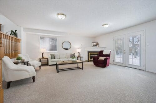 The family room offers garden doors and a cozy corner fireplace, creating a warm and welcoming atmosphere for relaxing evenings with family and friends. This level is completed by a generous bedroom with a large window and a convenient 3-piece bathroom, perfect for guests, extended family, or a home office.