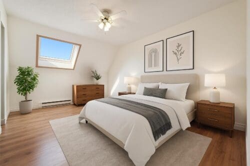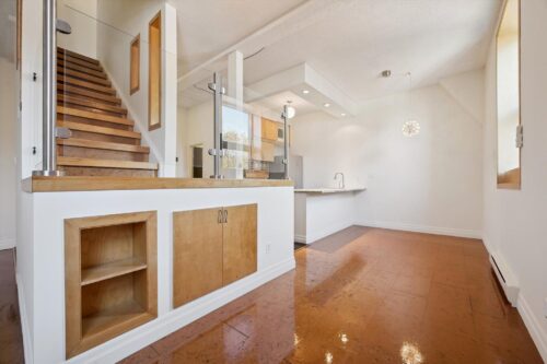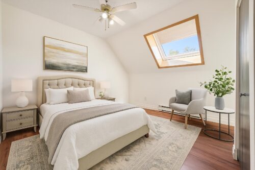 A sleek wood-and-glass staircase leads you to the upper level—where you’ll find three exceptionally large bedrooms – each bathed in natural light from oversized skylights that infuse the rooms with a warm, airy glow. It’s almost unheard of to find three true bedrooms in a condo setting, making this a standout choice for families, work-from-home buyers, or anyone who values room to breathe.