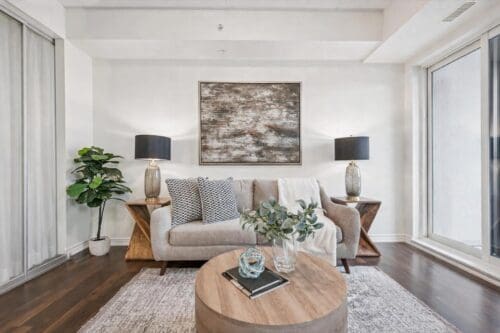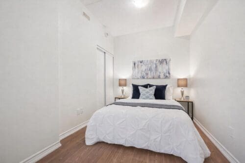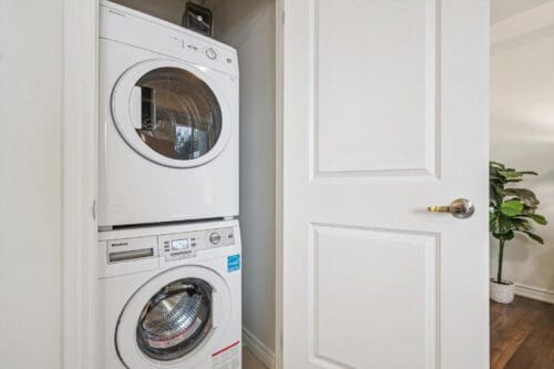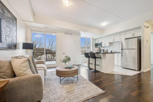 The modern kitchen anchors the space with a generous centre island, ideal for casual meals, studying, or hosting friends. Clean white cabinetry, stone counters, stainless steel appliances, and a sleek tile backsplash offer a timeless, low-maintenance finish that appeals to both owners and tenants.