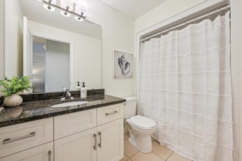 The unit features three generously sized bedrooms, each finished in a neutral palette with brand-new wide-plank flooring, creating move-in-ready spaces. Large windows in the primary bedroom bring in natural light and tranquil views. The layout is particularly well-suited for maximising rental income, or for young professionals seeking flexibility with a guest room and dedicated home office. The bathroom is finished with a modern vanity offering ample storage, stone countertops, and a full tub and shower combination.