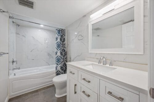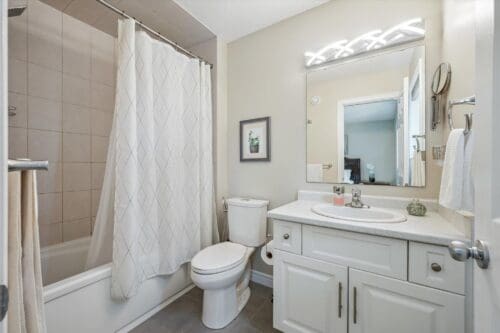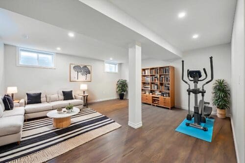 Downstairs, the professionally finished basement offers a massive rec room illuminated by three full-sized egress windows and enhanced with pot lighting—making it a bright, welcoming space for movie nights, a home gym, office, or creative studio. The sleek fourth bathroom offers marble-inspired porcelain tile and a quartz-topped modern vanity.