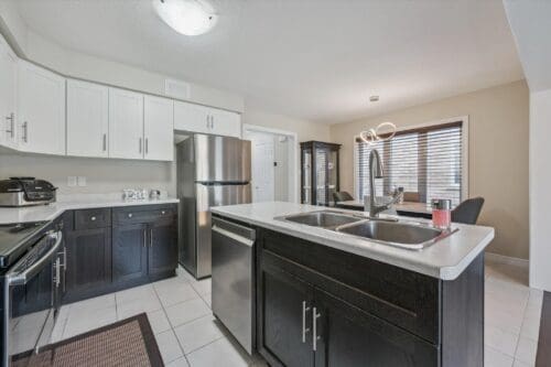 Charming curb appeal welcomes you with a covered front porch—ideal for enjoying your morning coffee—and an attached garage with a paved extension for extra parking. Step inside to a spacious, open-concept main floor where style meets function. The designer eat-in kitchen features trendy two-tone cabinetry, stainless steel appliances, and a large centre island for additional prep & storage space. The kitchen flows effortlessly into a bright dining area framed by an oversized window—perfect for family meals—and continues into a sun-drenched living room with luxury laminate floors, an elegant fireplace, double windows and sliding doors that draw the outside in. Completing this level is a convenient powder room.