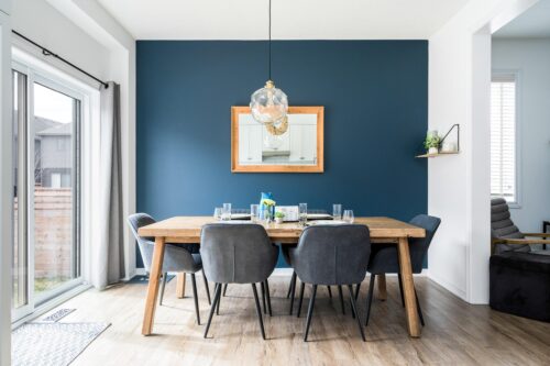 The kitchen is crisp and contemporary, featuring fresh white cabinetry, stainless steel appliances, a subway tile backsplash, ample counter space, and a built-in beverage fridge—perfect for entertaining. The dedicated dining area, highlighted by a stylish light fixture, overlooks the backyard and offers the ideal setting for family dinners or casual get-togethers. A 2-piece powder room completes the main level.