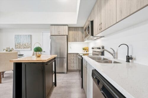 Step into the stylish, open-concept kitchen featuring sleek modern cabinetry, quartz countertops, subway tile backsplash, and stainless steel appliances. The layout flows effortlessly into the bright dining space and spacious living room with laminate flooring and a large picture window that floods the home with natural light.