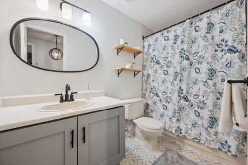 The second bedroom is bright and spacious with custom built-ins and is complemented by a well-appointed 4-piece bathroom with a large vanity and shower/tub combination.