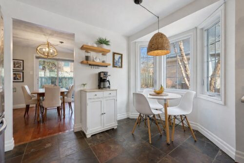 From the moment you step inside, you’ll notice the warmth of hardwood flooring and the thoughtful updates throughout. The spacious eat-in kitchen features sleek grey cabinetry, a fresh subway tile backsplash, stainless steel appliances, and plenty of counter space. Rustic wood display shelving adds character, while the charming bay window nook creates the perfect spot to enjoy your morning coffee surrounded by natural light.