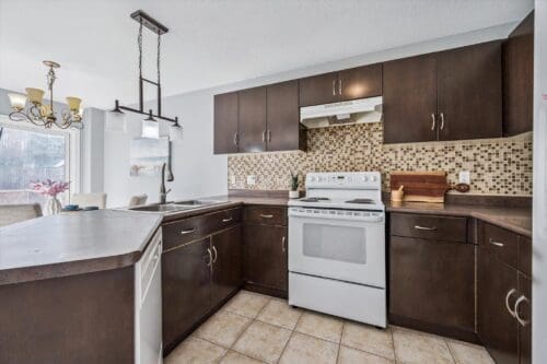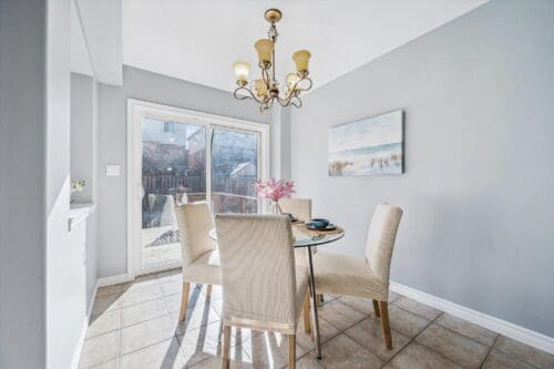 Upon entering, you are welcomed by a bright dining room with a large window, creating the perfect setting for family dinners or hosting guests. Toward the back of the home, you’ll find a spacious living room with a large window overlooking the backyard, seamlessly flowing into the eat-in kitchen featuring handsome dark cabinetry, a lovely tiled backsplash, and a breakfast bar for additional prep space.