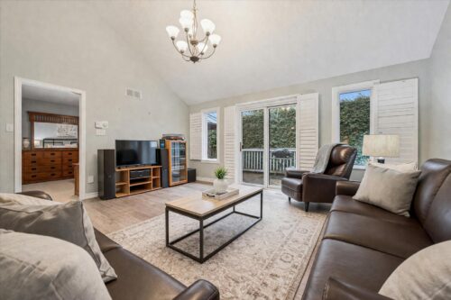 Step inside to a bright and inviting eat-in kitchen, featuring a timeless subway tile backsplash, high-end stainless steel appliances, and ample counter space—designed for both everyday living and effortless entertaining. The adjacent living room is truly the heart of the home, showcasing engineered hardwood floors, soaring vaulted ceilings, and an abundance of natural light pouring in through large windows and sliding doors—seamlessly connecting your indoor and outdoor living spaces.