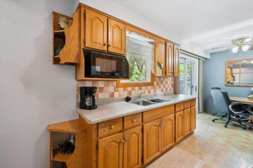 The kitchen offers generous cabinetry and countertop space, with a double sink perfectly positioned beneath a window overlooking the lush backyard—so you can keep an eye on your children while they play.