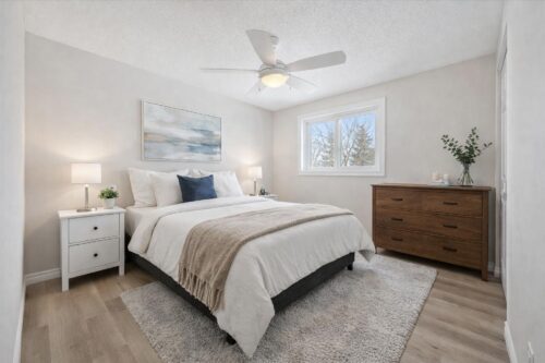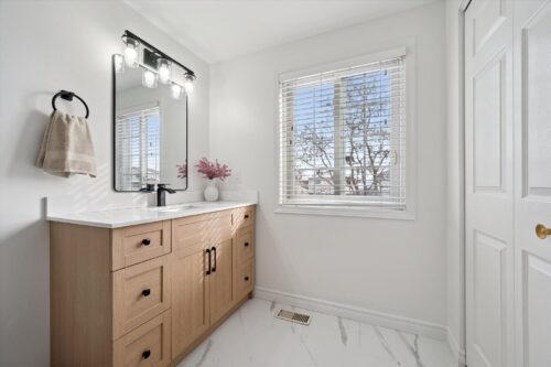 Upstairs, you’ll find three generously sized bedrooms, each with large windows and plenty of closet space. The renovated 4-piece bathroom features a chic vanity with quartz countertops, marble-inspired tile, a shower/tub combination, and an additional storage closet.