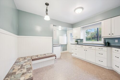 Step inside to discover a bright and airy living room with rich hardwood floors, oversized picture windows, and not one but two skylights that flood the space with natural light. The adjacent dining area with cork flooring opens to a stunning, light-filled kitchen featuring panoramic windows, custom wood cabinetry, butcher block counters, a farmhouse sink, and a sleek panel-ready fridge that blends seamlessly into the design. For entertainers and chefs alike, the additional prep kitchen provides ample storage, a beverage fridge, and a second sink – perfect for hosting holidays or everyday life with ease. A cozy sitting nook leads you to the back patio – the perfect spot to enjoy your morning coffee while listening to the birds.