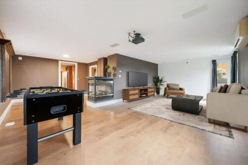 Upstairs, the oversized primary suite is a true retreat with large windows, private balcony access, and an enormous walk-in closet with custom organisers. Off the primary, you’ll find a flexible office space or dressing area and a massive bonus room – currently set up as a theatre and games room, complete with a 3-way gas fireplace, built-in speakers, and projector system.