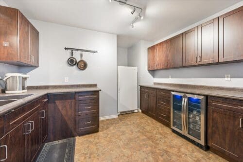 On the opposite wing, a second living room with a fireplace and charming built-in bench seating sets the stage for cosy family evenings. This wing also offers its own kitchenette, a beautifully renovated 4-piece bath with soaker tub and walk-in shower, and a spacious bedroom with a walk-in closet – ideal for an in-law suite or private guest quarters.