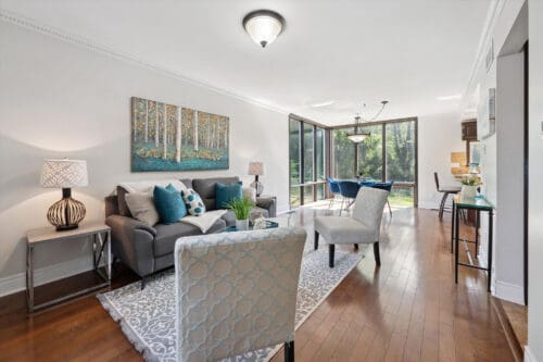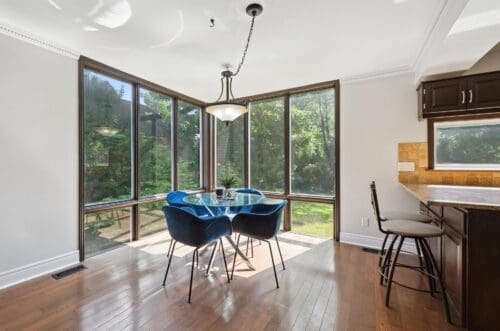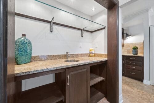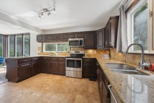 Step into the expansive kitchen with handsome dark cabinetry, a stunning backsplash, granite countertops, ample storage space and high-end stainless steel appliances. A sun-drenched dining/living area with floor-to-ceiling windows overlooks your serene backyard. Just off the kitchen, a convenient wet bar adds the perfect touch for prepping your morning coffee or serving guests with ease