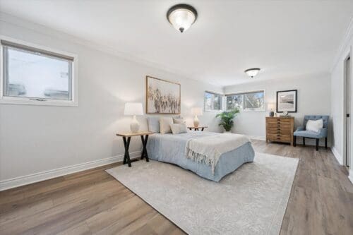 Follow the newly retreaded natural oak staircase to the upper level, where a generously sized primary bedroom awaits. This serene retreat features a full wall of closets and a convenient 2-piece ensuite. A second spacious bedroom is complemented by a beautifully updated 4-piece bathroom (2018), complete with a sleek double-sink vanity and a classic shower and tub combination.