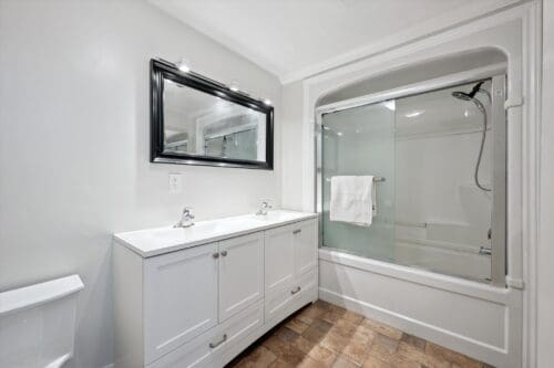 Upstairs, discover a massive primary bedroom with a wall of closets,hardwood floors and a 2 pc ensuite. There is a second large bedroom and elegant 4-piece bathroom (2018) offering a sleek vanity with double sinks and a shower/tub combo.