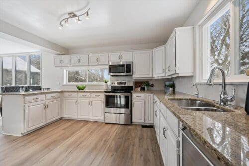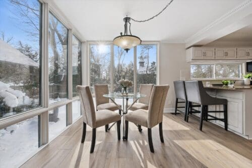 The heart of the home is a bright, open-concept kitchen with crisp white cabinetry, expansive granite countertops, reverse osmosis, and top-tier stainless steel appliances that create a timeless, move-in-ready aesthetic. A generous breakfast bar offers casual seating, while the adjoining dining space is wrapped in oversized windows that flood the room with natural light and frame tranquil views of the surrounding trees. Just off the kitchen, a convenient wet bar adds the perfect touch for prepping your morning coffee or serving guests with ease. Seamlessly flowing into the inviting living room offering a bright and comfortable space to relax or entertain, featuring new wide-plank flooring and elegant crown moulding that adds a timeless finish