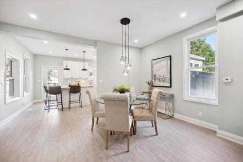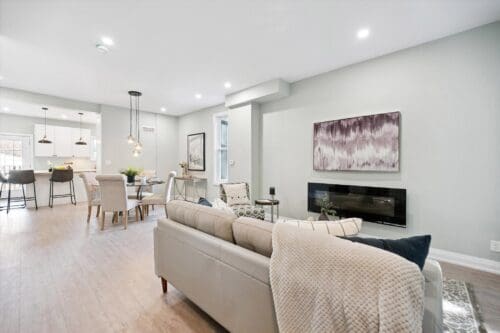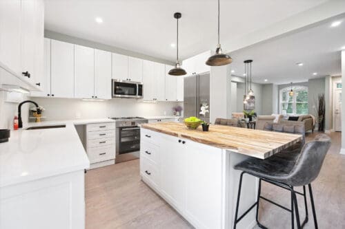The main floor features a sunlit open-concept living and dining area with a stunning arched picture window, scratch-resistant vinyl plank flooring, and pot lighting that creates a warm, welcoming atmosphere. The modern kitchen is a true highlight, with crisp white cabinetry, quartz countertops, a massive centre island with a butcher block top, pendant lighting, and direct access to the backyard for easy indoor-outdoor living.