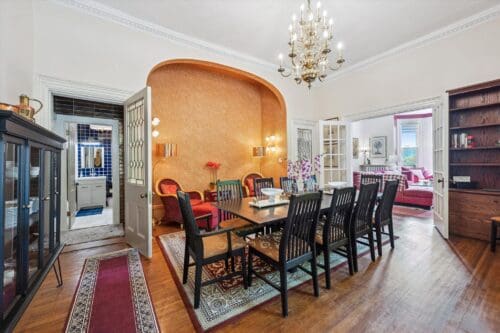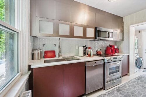 Each unit has been thoughtfully designed to blend historic character with modern functionality. Unit 1 is a spacious, light-filled three-bedroom, two-bathroom suite—perfect for the owner seeking upscale living while living for free. A sun-drenched great room features soaring ceilings, elegant crown moulding and a massive bay window. The kitchen is spacious, with abundant cabinetry & a large centre island. A formal dining room and separate family room provide ample space for entertaining or relaxation. The primary bedroom suite is a luxurious retreat—vaulted ceilings, multiple skylights and a wall of closets. Garden doors open to a private deck overlooking mature trees—a sanctuary to unwind. The renovated 3‑piece ensuite boasts an oversized glass shower and sleek floating vanity. Two additional bedrooms share a well-appointed 4‑piece bathroom. This unit connects directly to the finished basement, offering its own entrance, a private office with exposed stone walls, a wine cellar, a full kitchen and flexible living space—making it an ideal candidate for a sixth rental unit or expanded personal use.