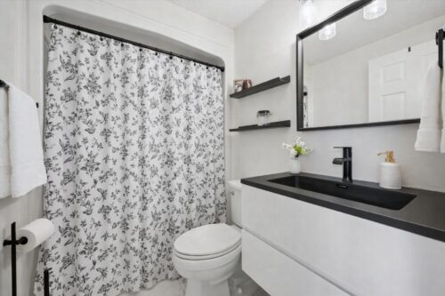 Upstairs, you’ll find a spacious primary retreat featuring hardwood floors, soaring vaulted ceilings, a stunning arched window that fills the room with natural light, and a massive walk-in closet. The newly renovated ensuite feels like a private spa with oversized tile flooring, a sleek floating vanity, and a stylish tiled shower. A gorgeous freestanding soaker tub with a sleek black exterior creates a striking focal point and the perfect place to relax and unwind.